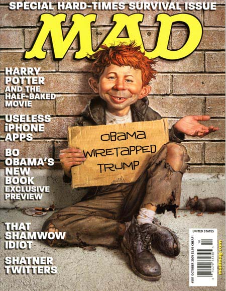 | Quote: | This is after all these denials at this hearing on Monday! But everybody knew what Trump meant. This is the thing. This is where things lose any sense of common sense or reality. People that voted for Trump knew exactly what he meant when talking about Obama “tapping the wires” at Trump Tower. They don’t think that Obama put on his intelligence uniform and found some deep, dark room in the basement of Trump Tower and started putting various cables in holes and jacks in the phone bank.